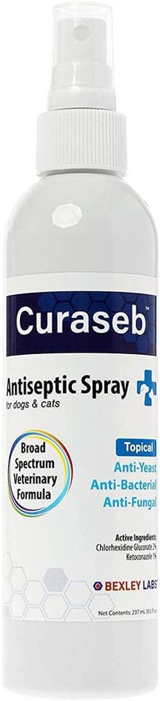 The veterinarian will use a combination treatment which includes ointments, creams, antifungal drugs, and shampoos, most commonly the Curaseb spray below.